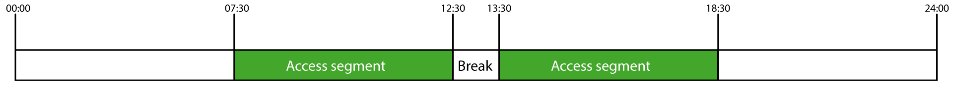 An access day consists of at least 1 interval (access segment). In the access segment, the start and stop time of the access is set.
