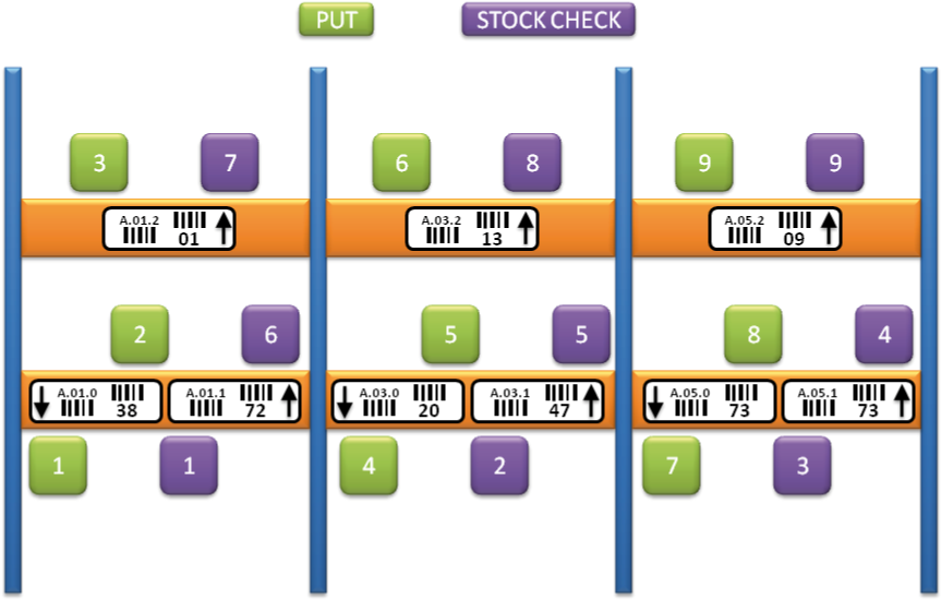 You can see in the figure above that by applying putaway and stock check sequences, putaway can take place from the start of the aisle to the left, from bottom to top, and to continue in this way to the right. When it concerns counting (stock check) another sequence is used. For example: As in this case a scissor lift is used, it would be more efficient to visit the various levels in a zigzag pattern. This minimizes the number of up and down movements of the scissor lift.