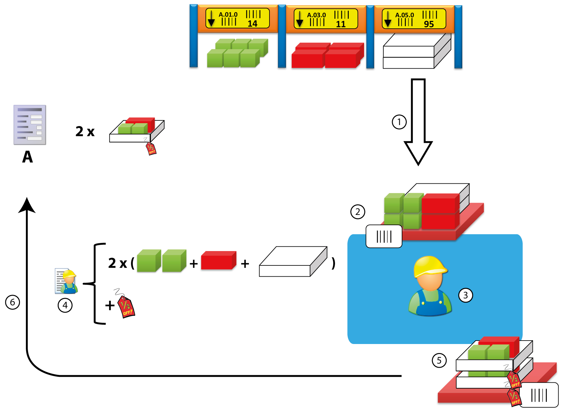 For example: Order A was made up to deliver 2 packages to a customer. The items are picked (1) and moved to the WIP-IN Location (2) of the KIT work center (3). At the KIT work center (3) the operator executes the instructions (4) relevant to the Kit operation. The kittings are moved to the WIP-OUT Location (5) of the KIT work center (3). The order is further executed via various actions (6).